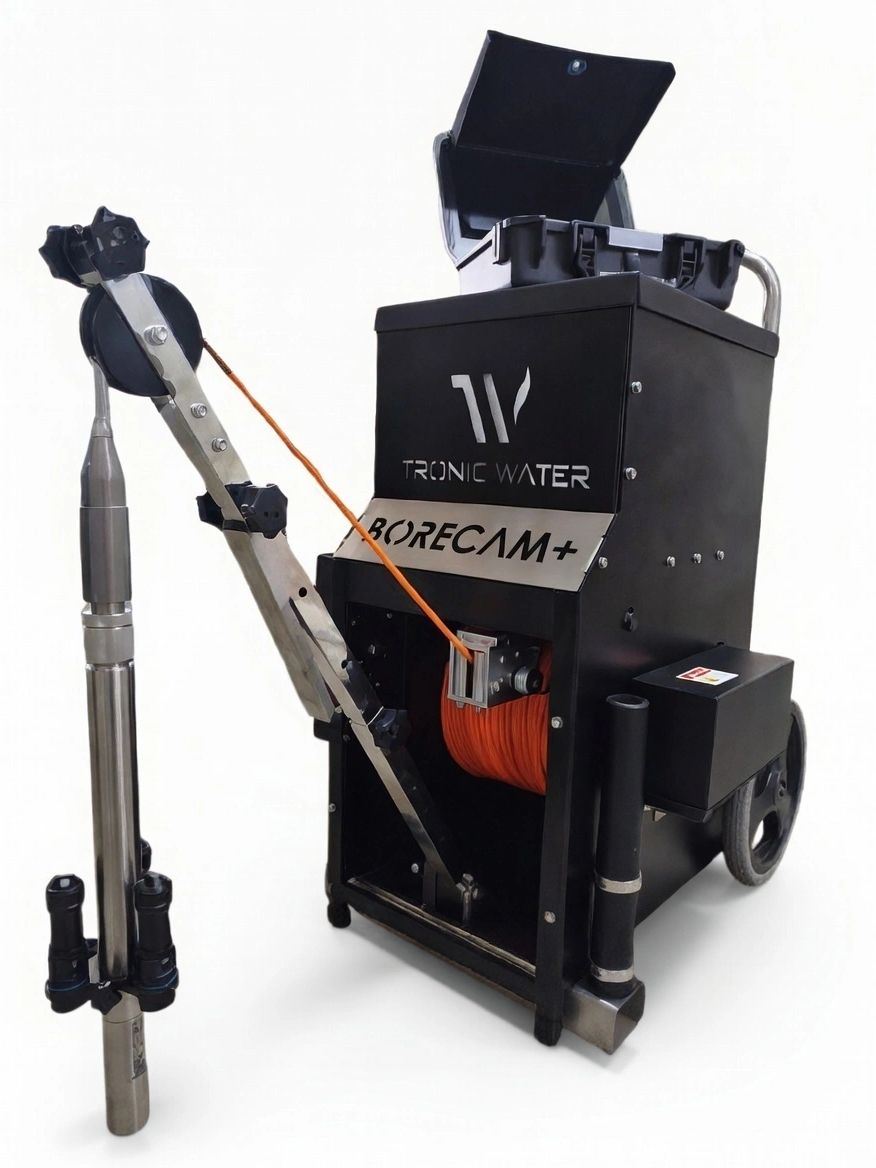 Cámara para Inspección de Pozos Profundos BORECAM300+ de la marca TronicWater , con lente de vista dual, con 300 metros de cable, camara digital de alta calidad sensor CMOS 1/3 de 1.3MP, monitor de 13" con DVR incorporado, memoria flash USB de 32GB , winche eléctrico con de velocidad variable y guiador de cable.